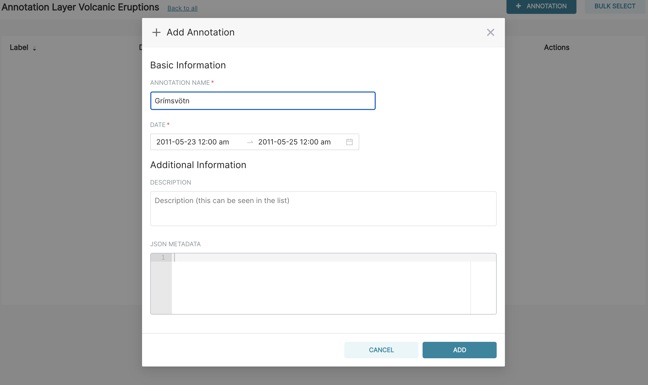 First, add an annotation layer by navigating to Manage ‣ Annotation Layers. Add a new annotation layer by selecting the green plus sign to add a new record. Enter the name Volcanic Eruptions and save. We can use this layer to refer to a number of different annotations.